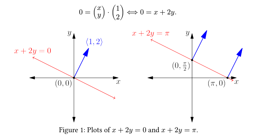 Here’s one situation where just numbers was enough: to explain to students why normal vectors were unique only up to scaling, I would just point out that and are equivalentIn general, multiplying by powers of and is something I did a lot. It makes scaling-type things a lot easier to see., so both or worked fine as normal vectors.